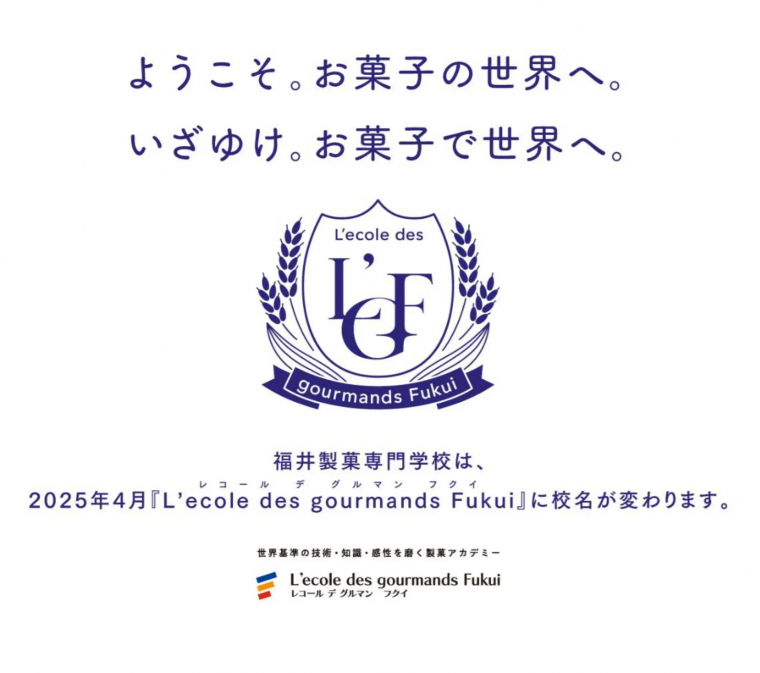 NEWS お知らせ お知らせ詳細 2024.12.17 お知らせ 福井製菓専門学校の校名を「L'ecole des gourmands Fukui」に変更します 福井製菓専門学校は令和7年4月に校名を「L'ecole des gourmands Fukui」に変更します。 「食を愛する人の学校」を校名に掲げ、世界基準の技術・知識・感性を磨く製菓academyとして、新たなスタートを切ります。 ようこそ。お菓子の世界へ。 いざゆけ。お菓子で世界へ。 https://fbs.kanaigakuen.ac.jp/ お知らせ一覧へ戻る CATEGORY お知らせイベントオープンキャンパス職員募集 SNS